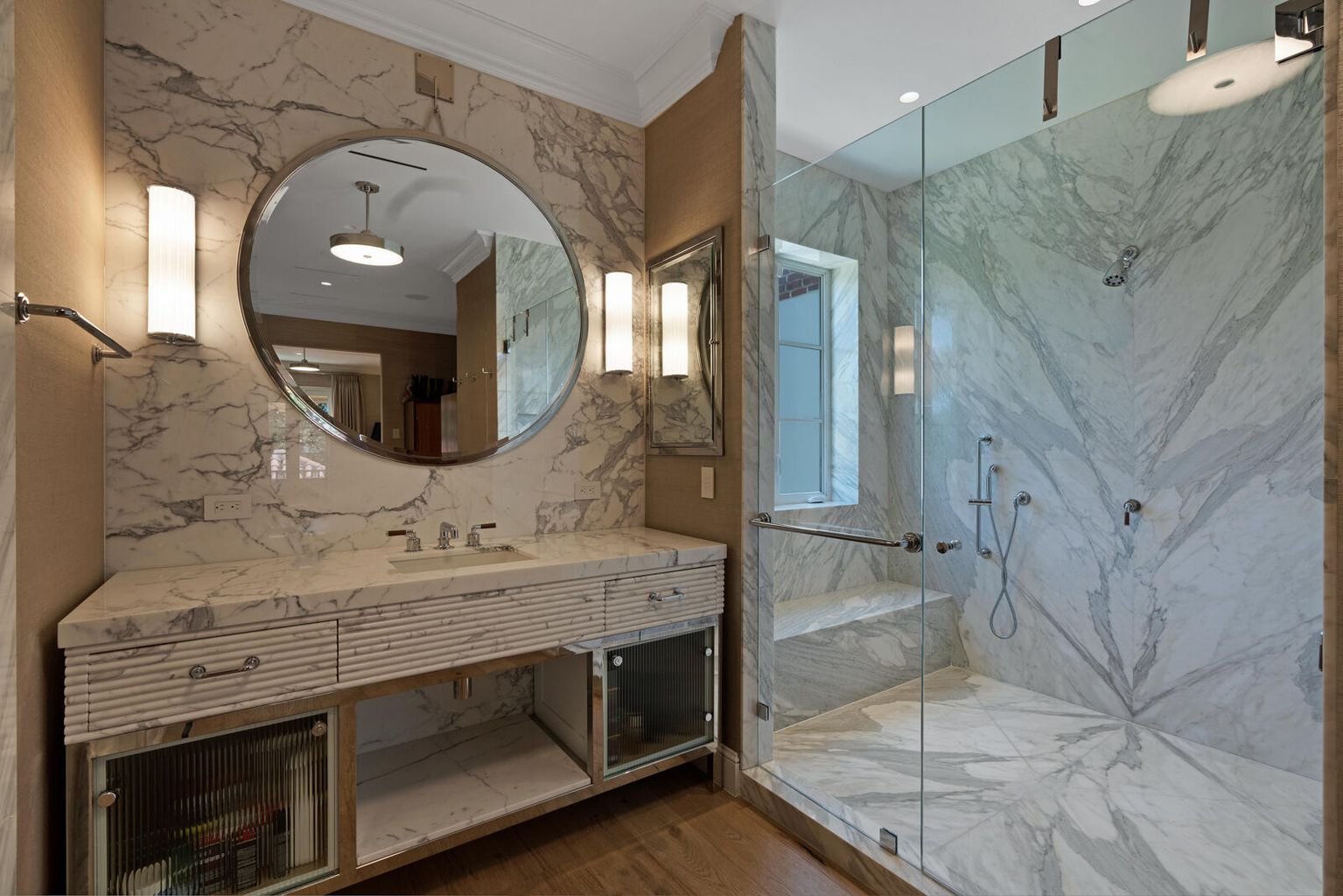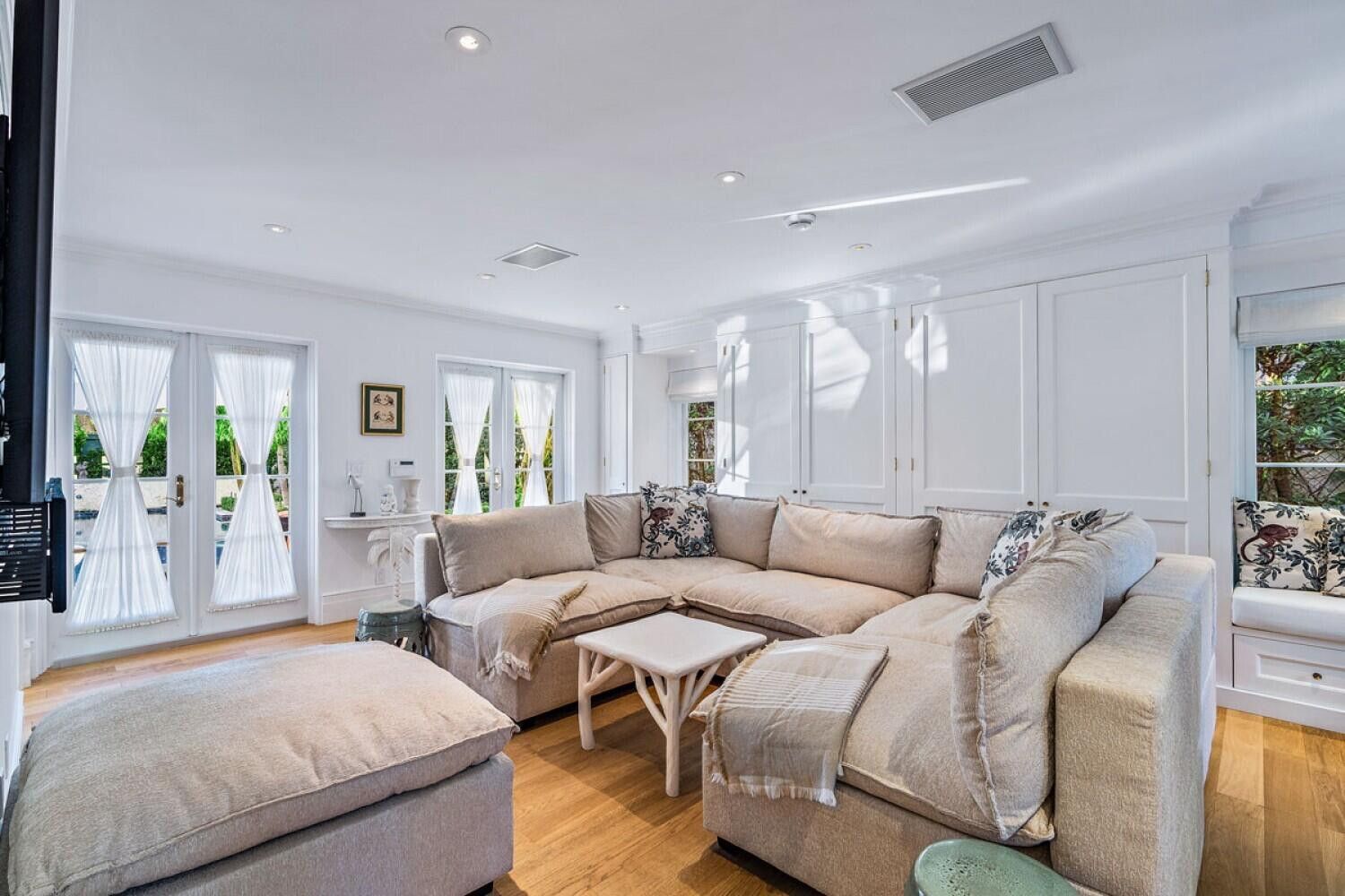 Entre sus numerosas comodidades se incluyen una sala de estar (con techos de 35 pies) con vigas originales de ciprés pecky estampadas, 3 chimeneas, suite principal con dos armarios y dos baños, bodega, ventanas y puertas resistentes a impactos, garaje para 6 coches + 4 plazas cubiertas en el exterior.
