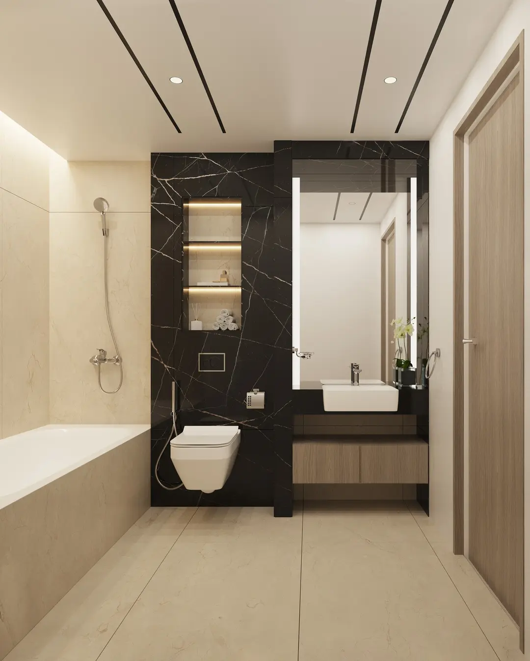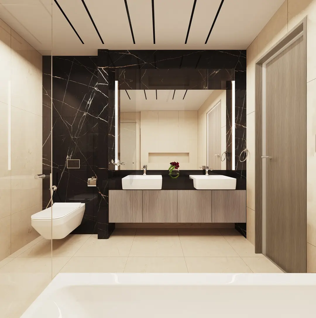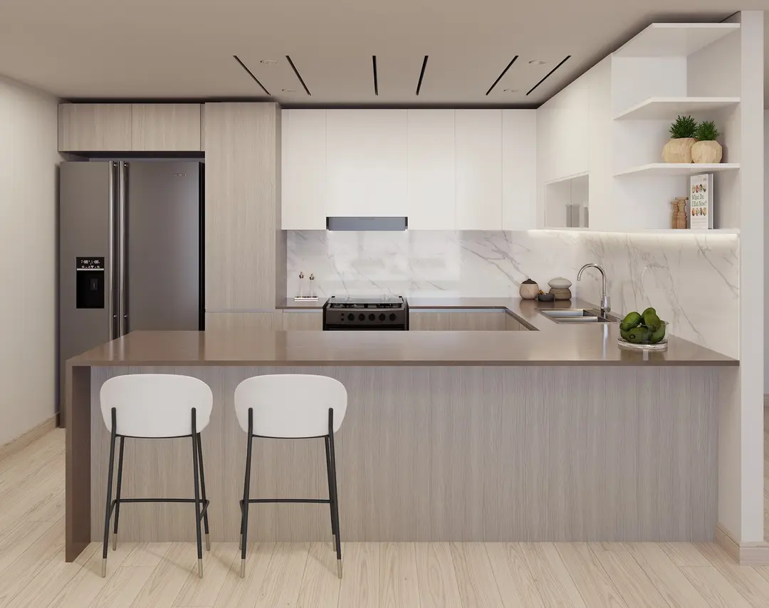 Los apartamentos (sin amueblar) destacan por su carpintería italiana de alta calidad, encimeras de cuarzo, mármol, piedras nobles y porcelánico gran formato. Los baños están completamente equipados con grifería y sanitarios Kohler, mientras que las cocinas incluyen electrodomésticos Siemens (cocina de gas con horno, refrigerador, lavadora/secadora).